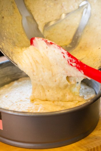 7. In a separate bowl, whip the egg whites until they hold soft peaks.  Use a rubber spatula to fold into the batter.  Pour the batter into the prepared pan.  Sprinkle the remaining coconut and 2 tablespoons turbinado sugar over the cake.