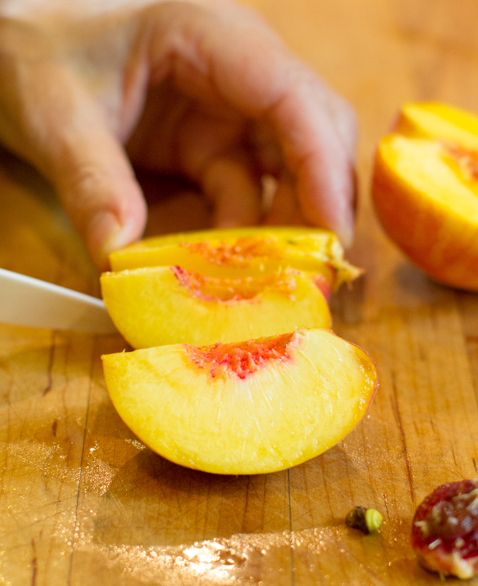 And yet… I haven’t done enough research to know whether the hybrids themselves have changed, or farmers are just finding that not everyone is in love with crunchiness, or super sweet white peaches, even if they do ripen to softness.  But the peaches I’ve been eating from farmers’ markets lately seem to have taken a step back toward their old-timey selves.  You still have to ripen them at home–I alternate between a brown paper bag and a shoebox, which is more protective–but they do get soft, not quivering-custard soft, but soft enough.  Also, you’ll notice the peaches in these photographs are distinctly yellow/orange.  I can attest that yellow peaches have a peachier flavor than white, along with an element of tartness in the finish.  If anyone reading this notices a similarity to my white-versus-yellow comments about corn last week, yeah, I noticed too.  It’s weird.  But I stand by both sets of observations.