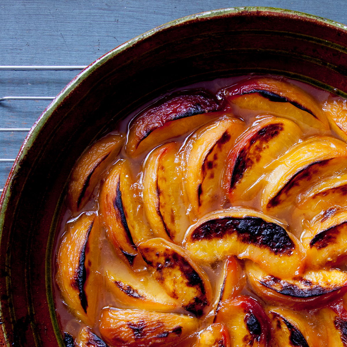 10. Bake on the lowest rack in the over for 30 minutes.  When the cake is out of the oven, turn the oven to broil and broil the peaches until slightly charred.  Cool.  When cool enough to handle, remove the skins, if you like.  Serve with the accumulated juices in the pan.