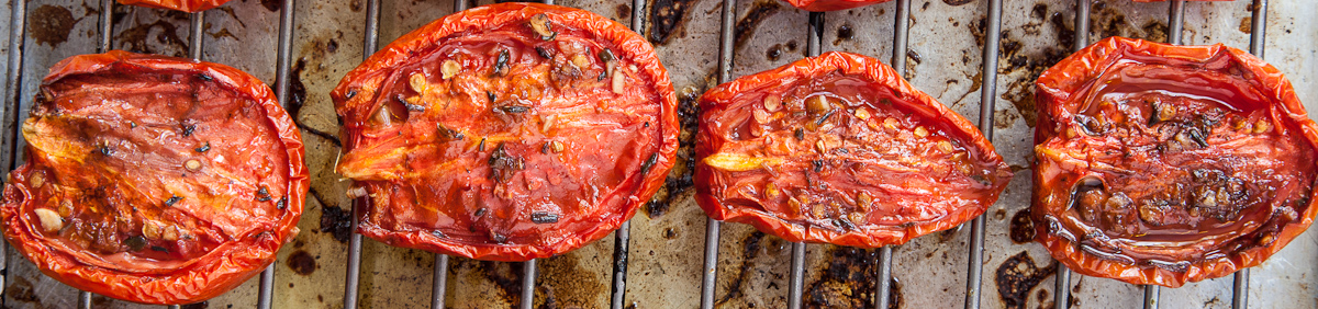 3. Arrange the tomatoes, cut-side up, in a single layer on a rack sitting on a rimmed baking sheet or in a shallow roasting pan.  Spoon any oil and vinegar remaining in the bowl over the tomatoes.  Roast  4-5 hours, depending on the moisture content of the tomatoes.  Begin checking after two hours, then every 30 minutes.  They’re done when the edges curl and the skin wrinkles, but they should still be juicy at the heart.  Let cool, then refrigerate in a tightly r covered container.