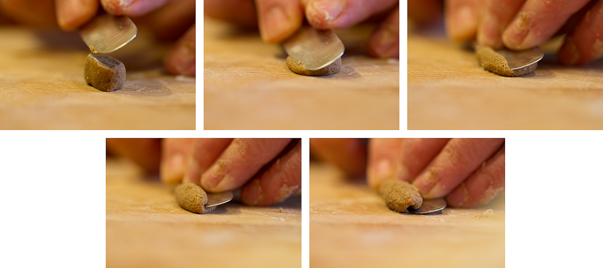 Don’t worry if this doesn’t mean anything to you – all will become clear once you give things a try. I’ve included two sets of photographs: one showing cavatelli being rolled a bit thicker than you want, and then a few others–after you’re steaming along–with a thinner curl. Ideally you’d like the curls of the opposite edges of the shape to meet in a line down the center, but if yours overlap, it’s not a big deal. You’re still going to get that little-kid-running down-the-street effect, I promise.