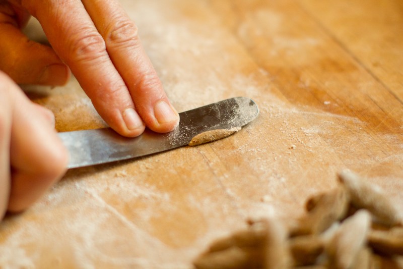 Puglian pasta made with farina arsa is not widely known, even in Italy. You can buy farina arsa orecchiette online, but hey, wouldn’t that take all the fun out of it?* Cavatelli, in our opinion, are easier to make to make than orecchiette. Perfect cavatelli are hard, but perfect anything is hard. And I guarantee your own speed and consistency will improve quickly. Here are a couple of tips. First, make sure the dough is kneaded until it’s smooth and elastic. If it’s sticky, add a little more floor. The second tip involves the technique for making cavatelli. In brief, you press down on a bit of dough with the blade of a knife and then draw the knife toward you as though you were trying to “smear” across the cutting board. The trick is to keep the blade of the knife close enough to the surface so that a curl of dough climbs up over the far edge of the blade, but not so close that you really do smear it across the cutting board. Beginners are typically afraid of the latter, so they don’t press down hard enough on the dough. The result is a very thick curl of dough, and thick cavatelli. Aim for a thin curl of pasta over the the edge of the knife.