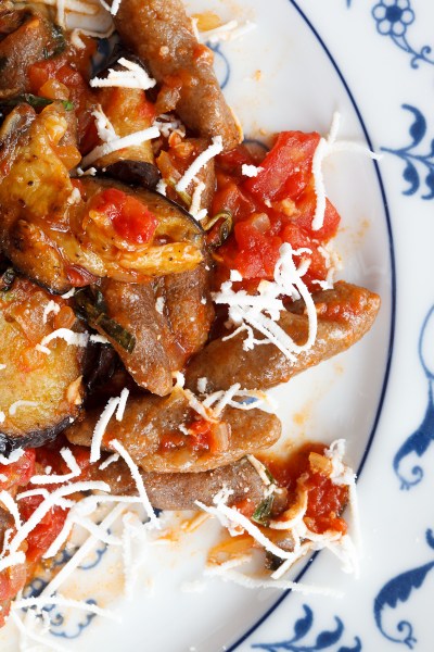 Making individual pasta shapes like cavatelli or orecchiette is nothing like rolling out noodles. The former is so gleeful, so hilariously liberating, that I can only compare it to being a little kid running naked down the street hollering, “Look at me! Look at me!” It’s just that great. Er… what? You never ran outside naked as a kid? Really? Never? Well, sounds to me like somebody’s got some serious catching up to do. No, don’t take your clothes off–we’re all adults now–the naked-in-the-street developmental train left the station some time ago. But that’s okay–you can still make Cavatelli with Tomato-Eggplant Sauce. You probably don’t believe me now, but if you share the joy and invite a friend with a bottle of wine to help hilarity will ensue. Everyone’s first dozen cavatelli are just that funny. Yours, mine, everyone’s. Don’t throw them away–they deserve to be eaten–and you’ll get better so fast you’ll need them as a reminder of what a beginner you used to be.