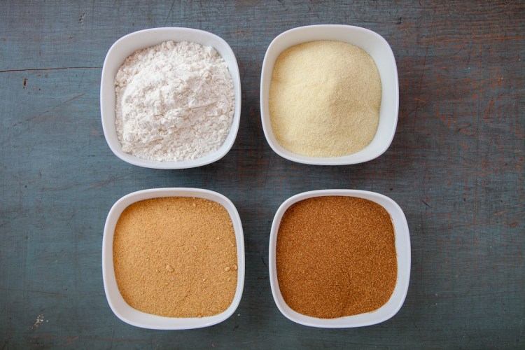 The top two are regular flour and semolina. The botton two are toasted semolina – the one on the left in the oven; the one on the right in a heavy-bottomed sauté pan atop the stove.