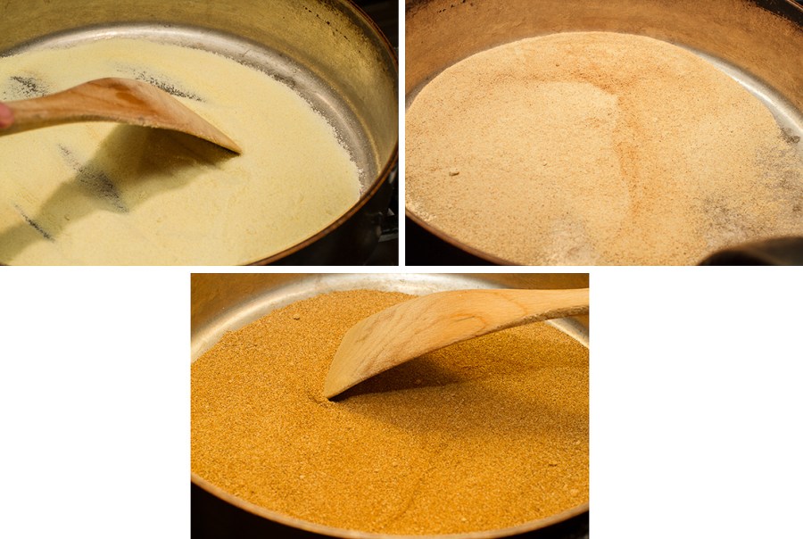 FYI, if you don’t have semolina, use all-purpose flour and toast just part of it.