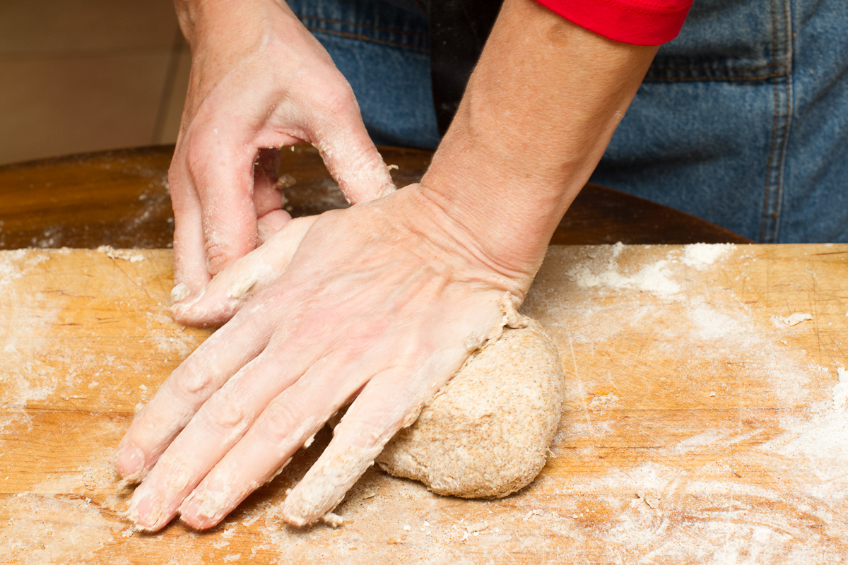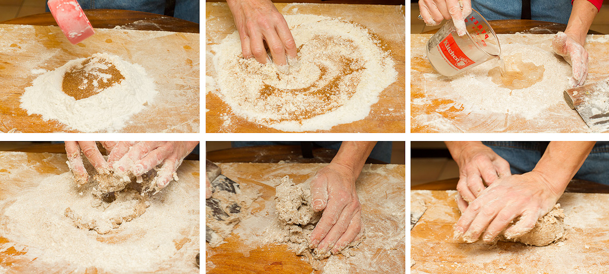 - Toss the the flours together in a mound on the counter. Use your fingers or a fork to mix them together. Return everything to a mound shape, then make a well in the center. Add the salt and a little water to dissolve the salt. Use your fingers to work the salt into the water. Slowly add the remaining water, working everything into a soft shaggy mass, then begin kneading it. Knead for 10 minutes or until smooth and elastic.