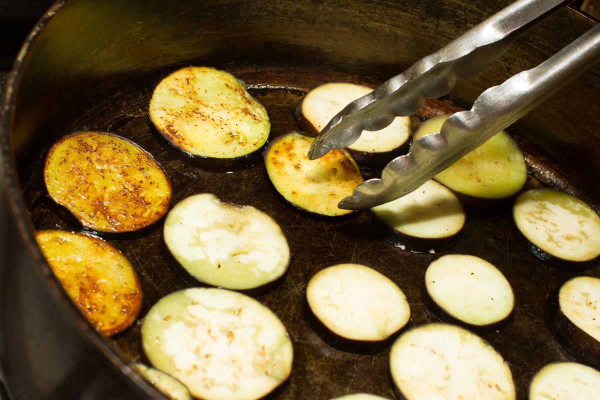 - Heat 2 tablespoons oil in a large saute pan over medium-high heat. Add eggplant slices in a singer layer. It should be about half the slices. Cover and cook 5 minutes or until golden brown. Flip and cook briefly on the second side until they have a little color. Transfer to a plate. Repeat with the remaining eggplant.*