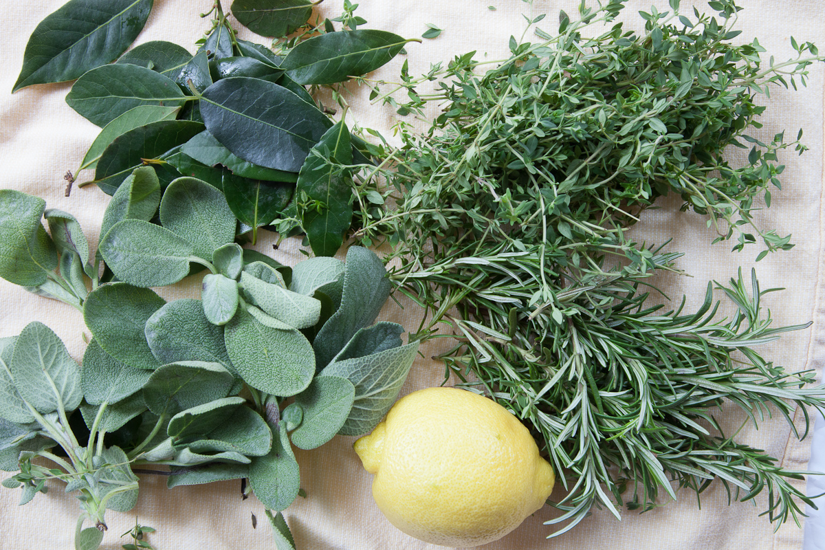 •  4 sprigs each, thyme, sage, rosemary and 4 bay leaves