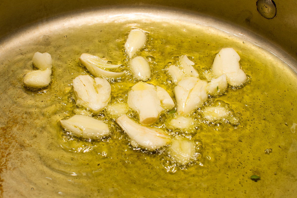 3. Heat the oil in a large frying pan over medium-high heat. Just before it starts to smoke, add the garlic and cook 1 minute on each side or until golden brown.  Add the herbs and cook 1 minute, tossing occasionally or until the leaves are crisp, but not burned.  This will happen very quickly.  Remove the herbs and garlic from the pan.  Discard the bay leaves.