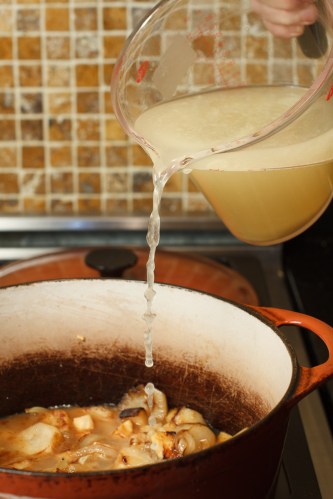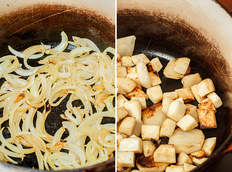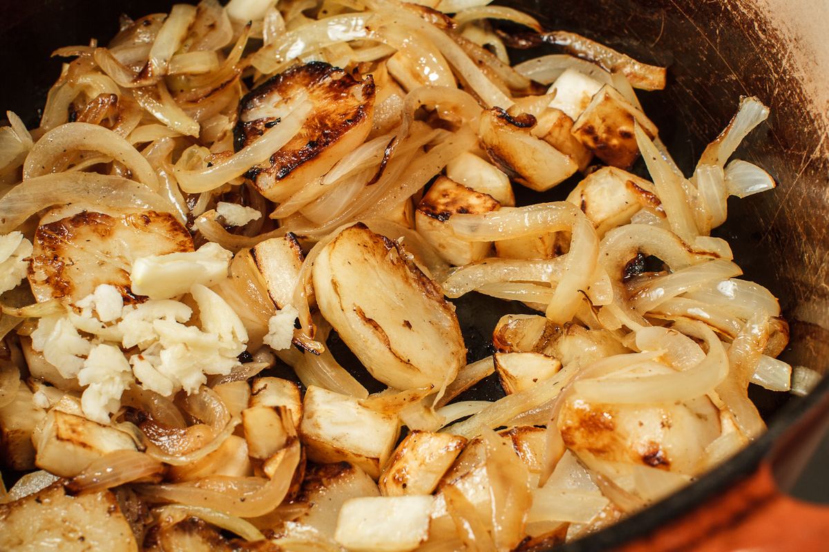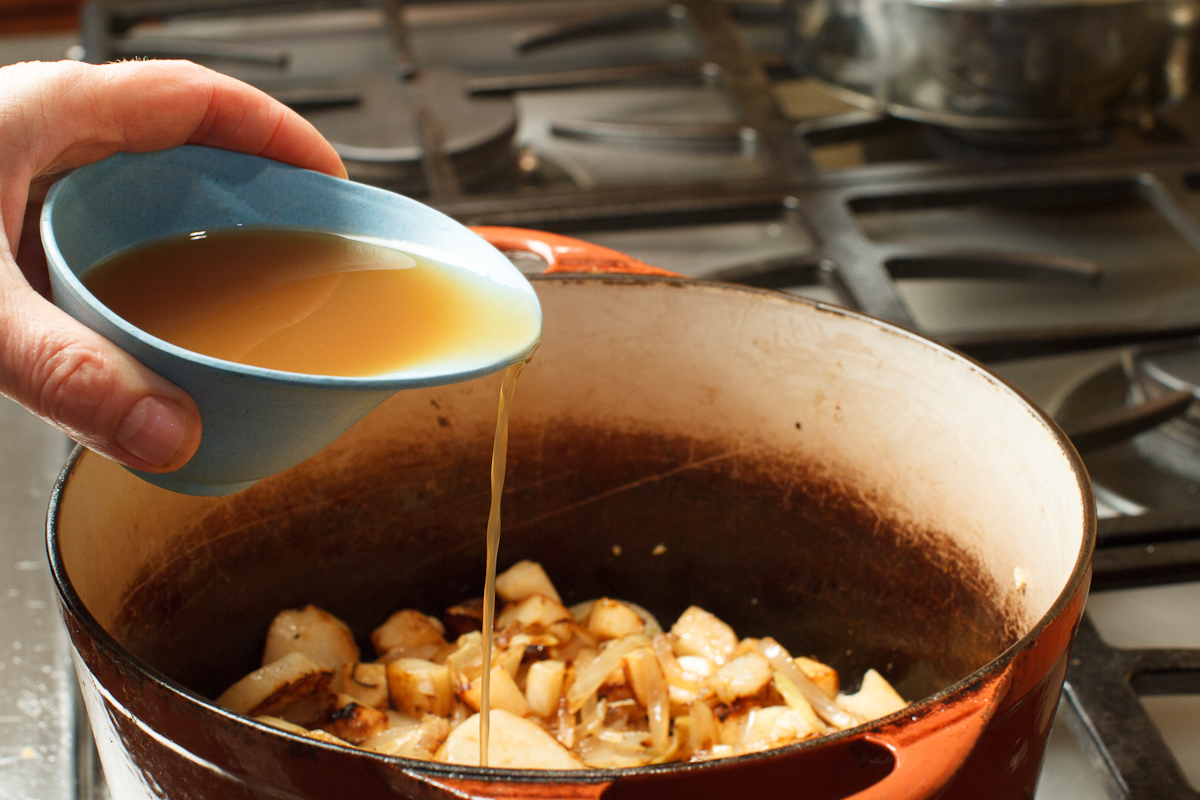 2. Add the remaining  butter to the saucepan.  Add the celery root and sunchokes and sear all over.  Turn the heat to low.  Add the garlic, return the onions to the pot and season with salt and pepper and cook 1 minutes.  Add the apple cider and reduce to a glaze. Add the chicken stock and cook until the roots are tender enough to purée, about half an hour.