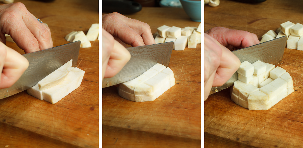 • 1 small celery root (about ¾ pound), peeled and diced into ½-inch cubes