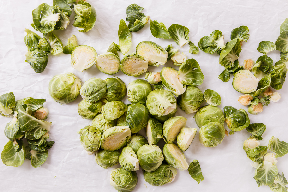 2. Trim the bottoms of the sprouts and peel off any tough outer leaves. Cut each sprout in half lengthwise through the root.