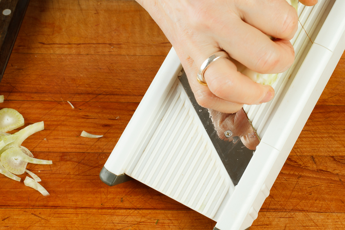 Spanish Mackerel, Saffron and Honey with Fennel – Blood Orange Salad-10 January 23, 2014 by Jody and Ken Don’t try this at home! Use a protective glove or the slicing grip!