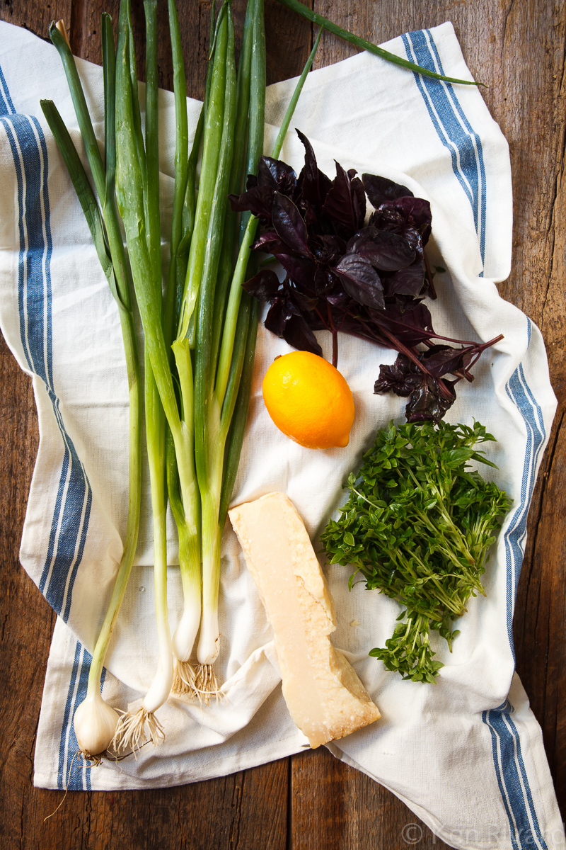 • 1 large bunch purple basil (we also used bush basil), enough for 1½ cups small or torn leaves