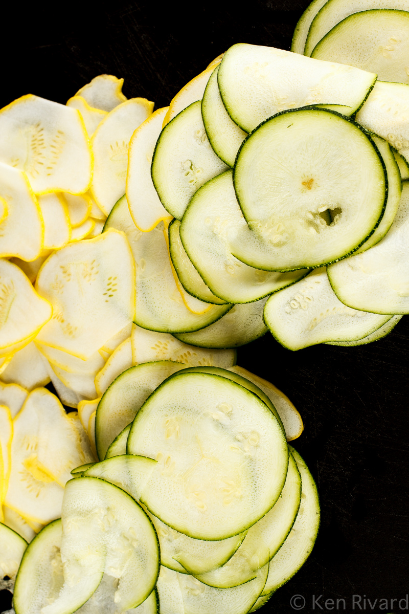 1. Trim the stems off the squashes. Using a mandoline, slice the squashes thinly.