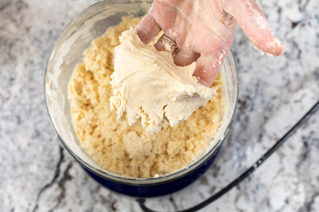 - Add the water and process until the mixture just comes together, about 30 seconds. Check for texture by squeezing some in your hand. It should just hold together.