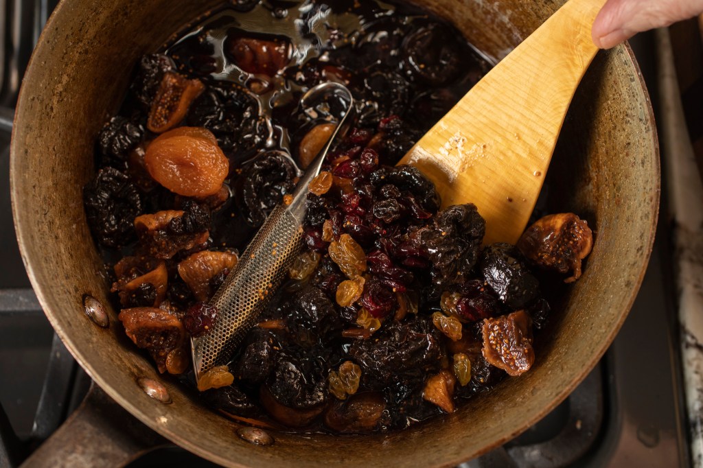 The recipe suggests figs, prunes and apricots, but if you happen to have some dried peach halves or cherries that have seen better days, feel free to add some in; a few chopped walnuts wouldn’t be amiss either.