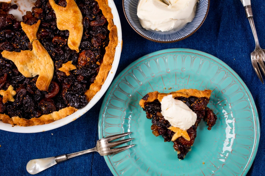 This dish is an easy treat, an excuse to create a buttery crust to hold the mixture of dried fruit mulled in red wine suspended in a thick syrup flavored with cinnamon, peppercorns, and both fresh and dried herbs. A slice of Dried Fruit Tart begs for a scoop of crème fraîche, vanilla ice cream or even full-fat Greek yogurt. And who couldn’t use a treat these days?