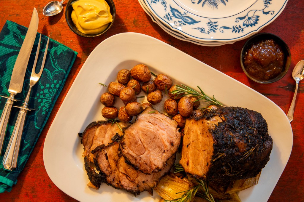 Nowadays, with a little research, you can buy heritage pork whose ears have never heard the words “restraint” or “diet” or “growth hormones.” Heritage is old school pork suffused with delicious fat, but it’s also expensive, and can be difficult to find. If you can’t be bothered to seek it out, the best sources of fatty pork, even on today’s leaner pigs, are pork belly, pork butt and pork shoulder, the latter two both fatty cuts with tough muscle. Both are best cooked slowly, but a butt has more intramuscular fat and the boneless butt makes a convenient roast. A boneless pork shoulder is often sold wrapped inside a net and when you remove the net the meat unrolls, which is helpful if you want to stuff it, for example, and roll it up again, or lie it flat on the grill of a smoker. Tying it up again for slow-roasting is a shade trickier than with a butt. For this recipe we prefer the butt, especially because the cap of fat left on the butt melts down into the meat during cooking.