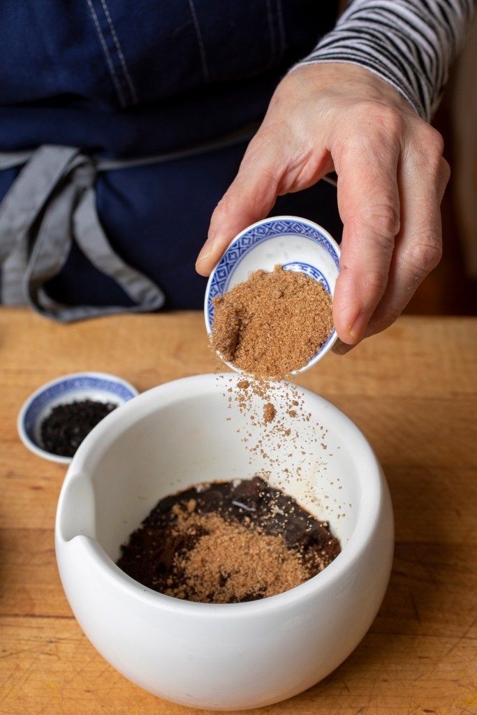- Put the coffee into a mortar and grind to breakdown the grounds. Add the fish sauce, sugar, garlic, Urfa pepper, and vinegar and grind into a thin paste.
