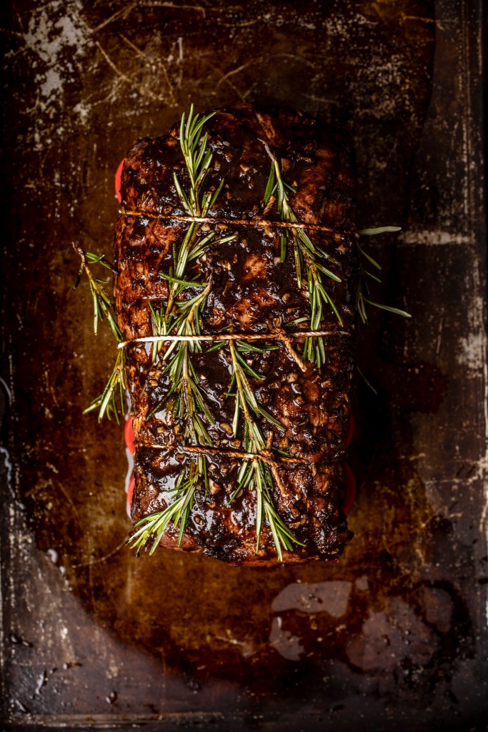 - Tie 3 – 4 lengths of string around the pork to hold the rosemary in place.