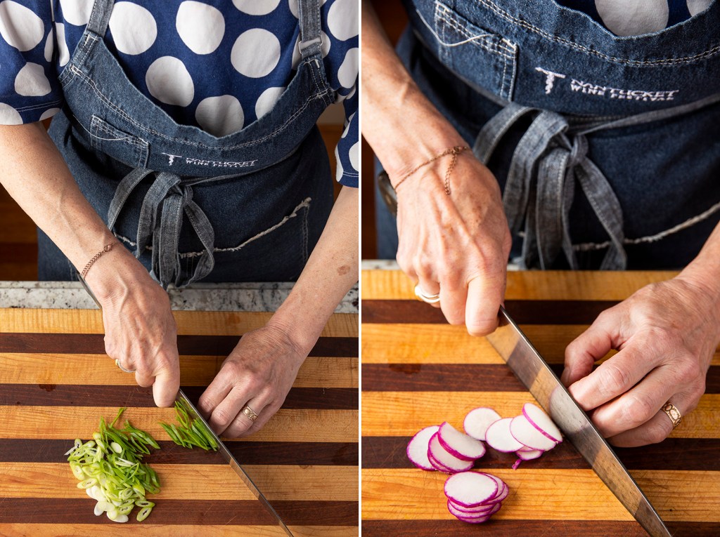 - Toss before serving and add any left over scallions, radishes or chilis as desired.