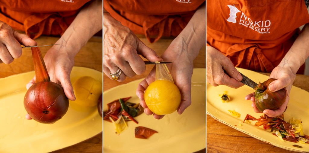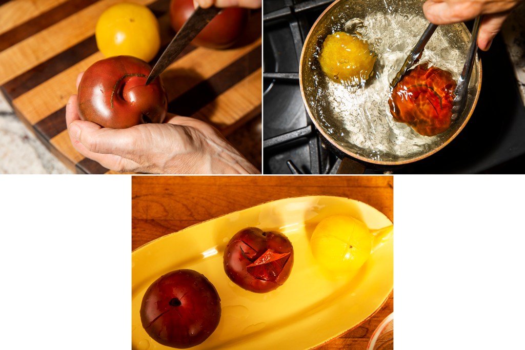 1. Bring a large pot of water to a boil. Prepare an ice bath.  Score the large tomatoes.  Put the tomatoes into the boiling water for 10 seconds.  Transfer immediately to an ice bath.