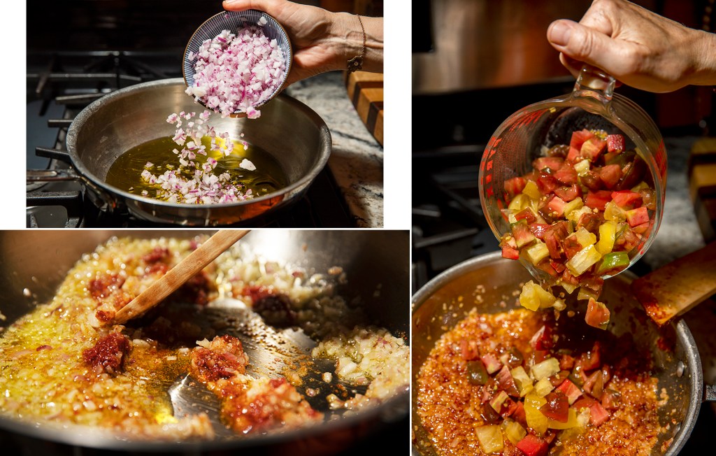 4. Heat the remaining oil in a deep sided saute pan over medium heat. Add the onion and cook until tender, 5-7 minutes.  Add the garlic and cook for about a minute.  Season with salt.