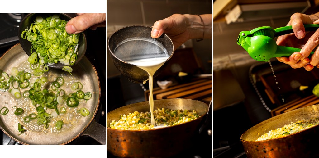 - Heat 1 tablespoon butter in a medium saute pan. Add the scallions and Serrano pepper, season with salt and pepper, and cook until just wilted, about 2 minutes.