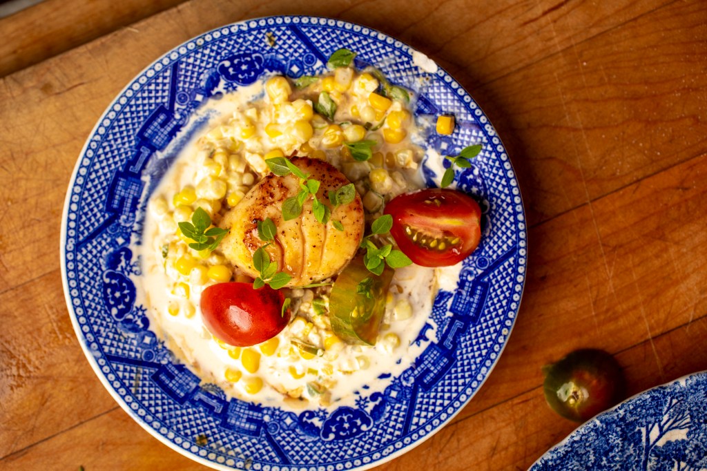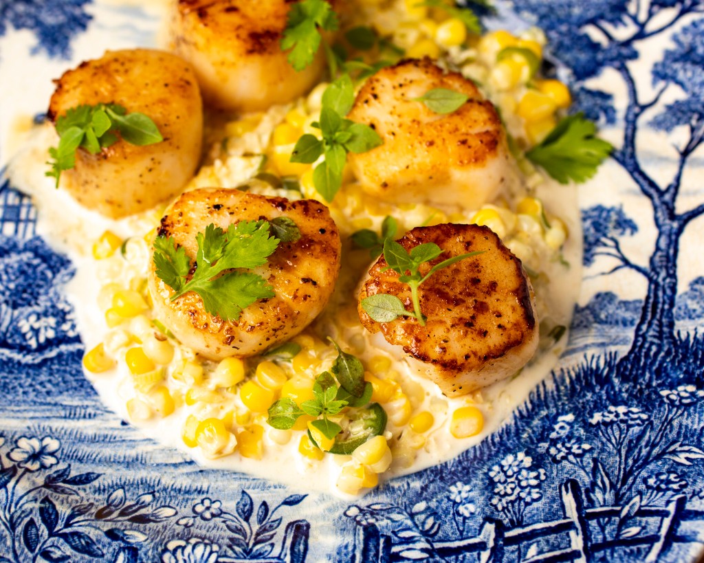 - Serve the scallops on the warm creamy corn and top with torn basil leaves and/or cilantro leaves. In my case I happened to have a variety of micro basil growing in my garden, so I used that.