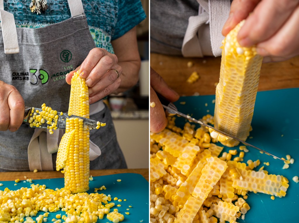 - Strip the corn off the cob, taking care to remove any silky strings. You should have 2 cups or so.