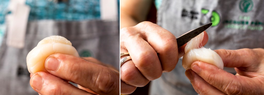- Remove the abductor muscle, or “sneaker” as we call it in the biz, from the scallops. (If you were to be making a sauce that was going to be strained, you could use the sneakers.) Season the scallops with salt and pepper.