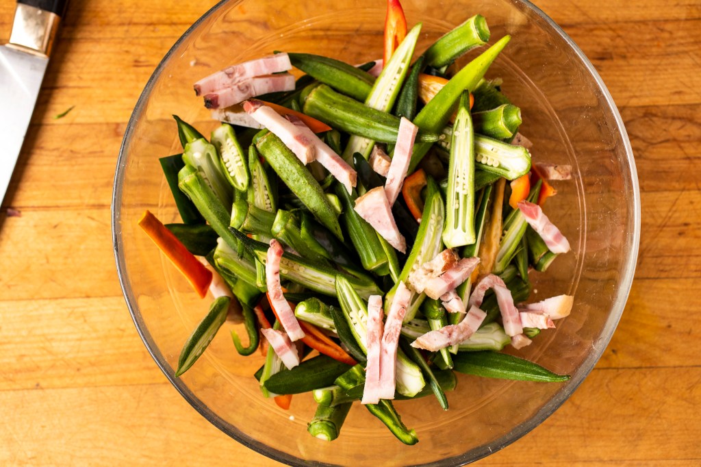 Roasted Okra with Guanciale, Peppers and Anchovies