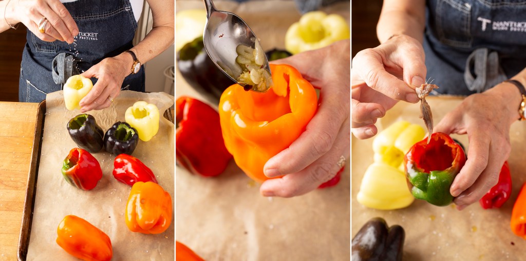 - Cut the tops off the peppers and remove the seeds and ribs. Season with salt.