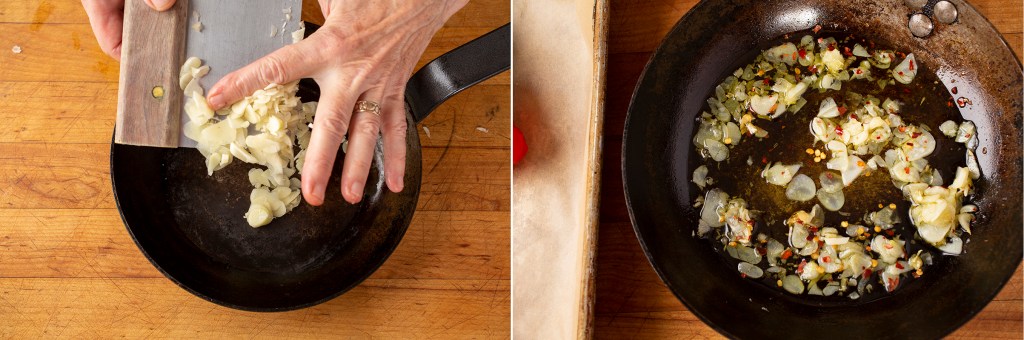 - Heat ¼ cup of the oil with the garlic over medium-low heat and cook until tender, about 6 minutes. Season with salt and hot pepper. Cool.